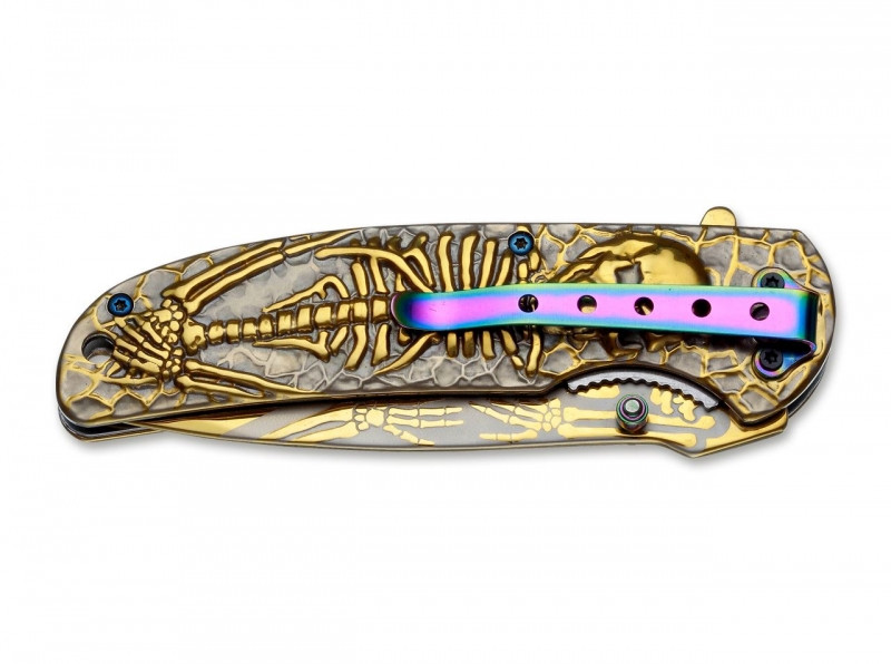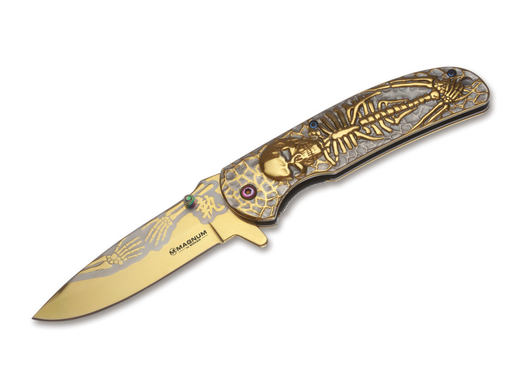 Böker Magnum Golden Dia de los Muertos - zsebkés, bicska, arany színű, csontváz dombormintás